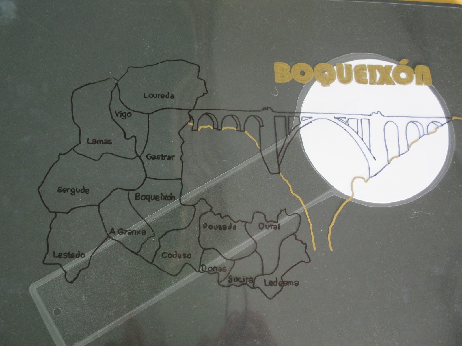 varias láminas de acetato, tanto letra coma debuxos.